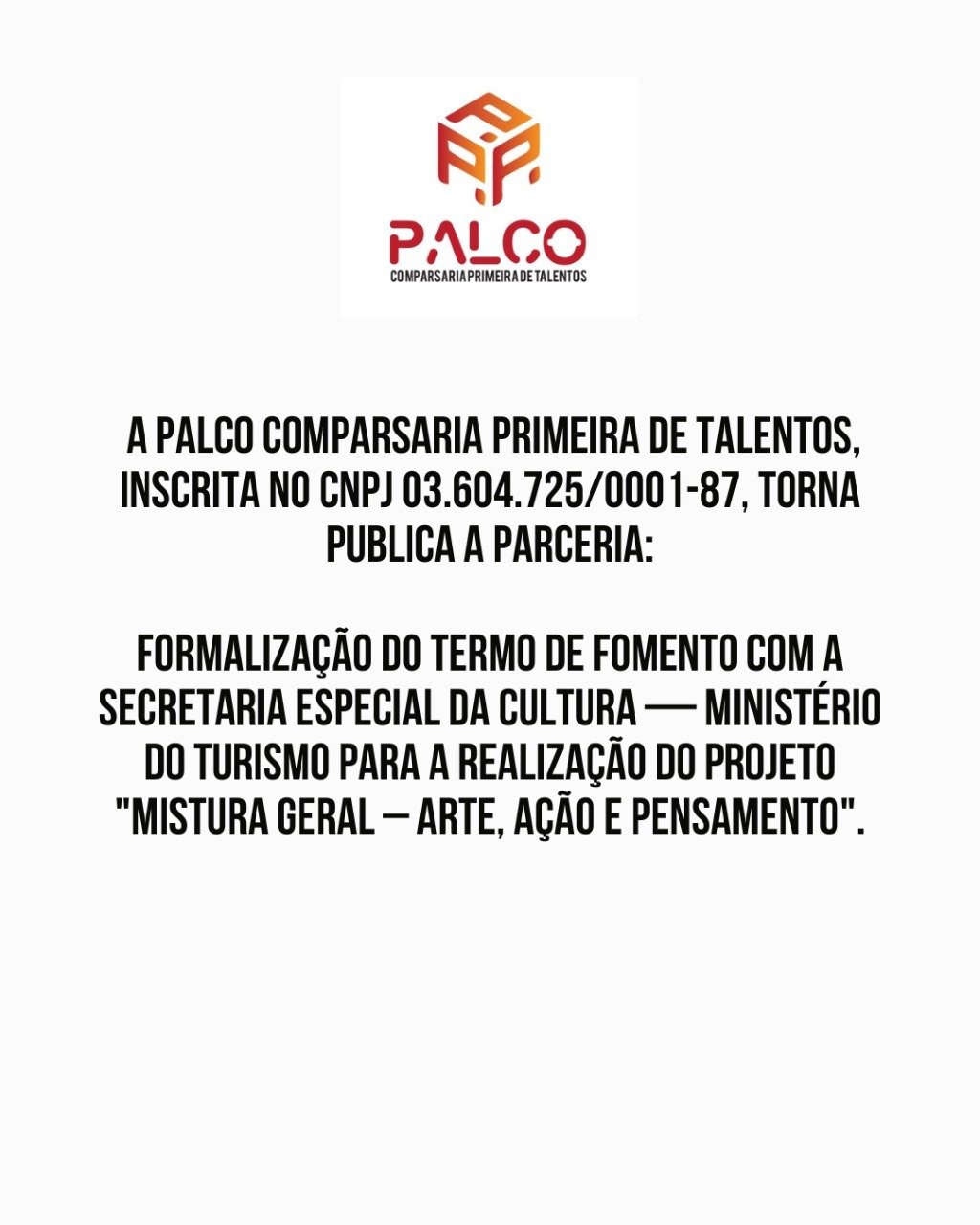 - Órgão Concedente: Secretaria Especial da Cultura – Ministério do Turismo