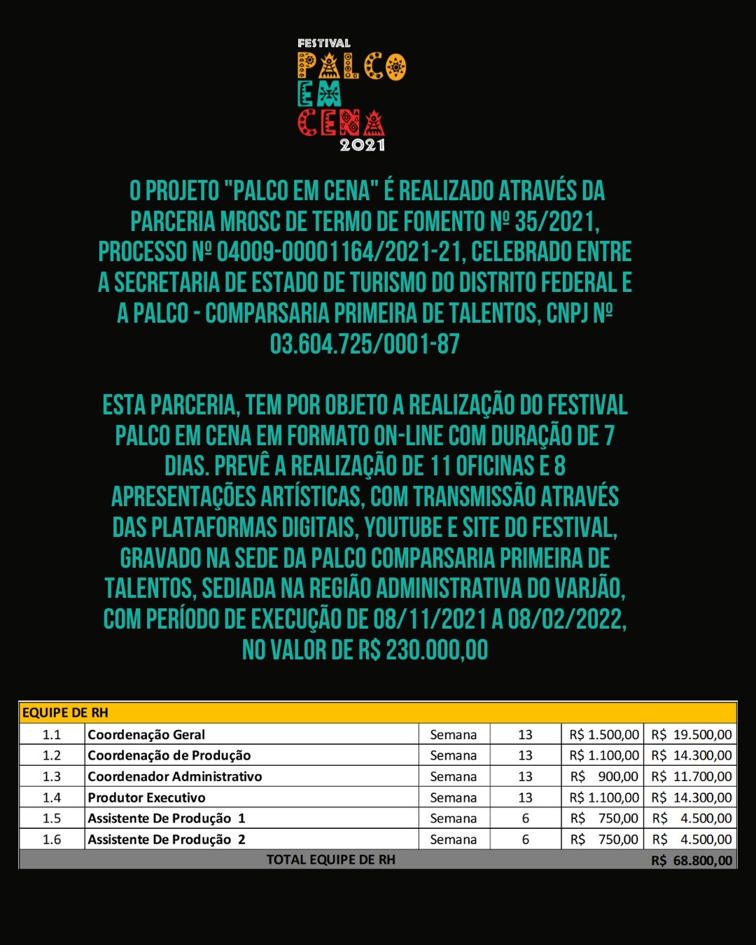 O projeto consistiu na realização do Festival Palco em Cena em formato on-line, com duração de sete dias. Foram realizadas 11 oficinas e 8 apresentações artísticas, com gravações na sede da Comparsaria Primeira de Talentos, no Varjão.
