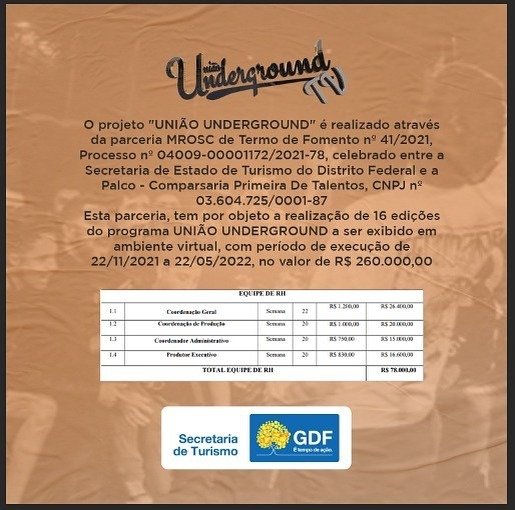 O projeto União Underground foi realizado por meio de parceria MROSC, com o objetivo de executar 16 edições do programa em formato on-line (YouTube). A iniciativa promoveu artistas da cultura urbana e fomentou a economia criativa local.