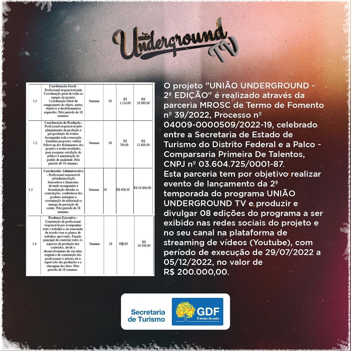 - Órgão Concedente: Secretaria de State de Turismo do Distrito Federal